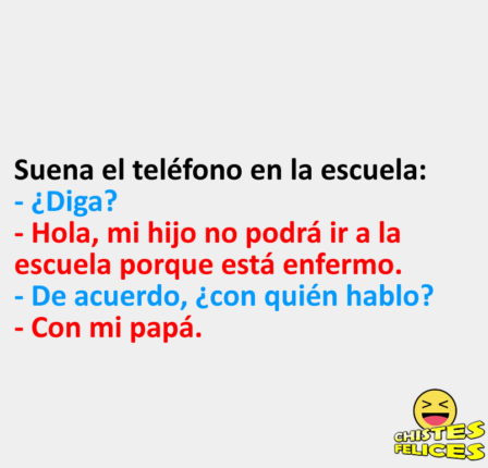 Chistes – Suena el teléfono en la escuela: ¿Diga? Hola, mi hijo no podrá ir a la escuela porque está enfermo. De acuerdo, ¿con quién hablo? Con mi papá.