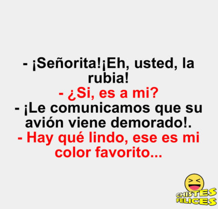 – ¡Señorita!¡Eh, usted, la rubia!– ¿Si, es a mi?– ¡Le comunicamos que su avión viene demorado!.– Hay qué lindo, ese es mi color favorito…