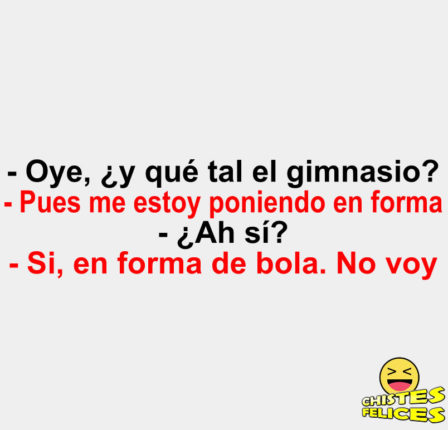 – Oye, ¿y qué tal el gimnasio?– Pues me estoy poniendo en forma– ¿Ah sí?– Si, en forma de bola. No voy