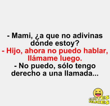 – Mami, ¿a que no adivinas dónde estoy?– Hijo, ahora no puedo hablar, llámame luego.– No puedo, sólo tengo derecho a una llamada…