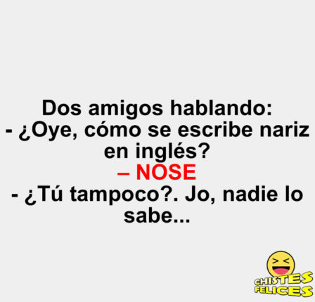 Dos amigos hablando:– ¿Oye, cómo se escribe nariz en inglés?– NOSE– ¿Tú tampoco?. Jo, nadie lo sabe…