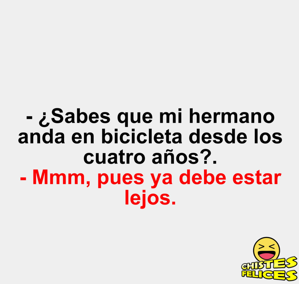 Desde los 4 años Chistes felices hace 7 años – ¿Sabes que mi hermano anda en bicicleta desde los cuatro años?.– Mmm, pues ya debe estar lejos. Facebook Commentarios Ver más