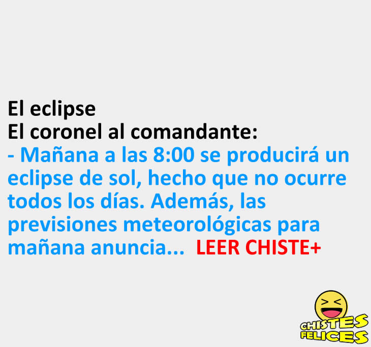 – Por orden del señor coronel, mañana a las 8:00 tendrá lugar en el gimnasio la inauguración del eclipse de sol en traje de campaña. El señor coronel dará las órdenes oportunas de si debe llover o no, hecho que no ocurre todos los días. Si hace buen tiempo y no llueve, el eclipse tendrá lugar en el patio.